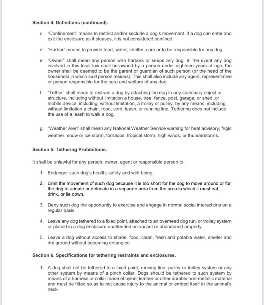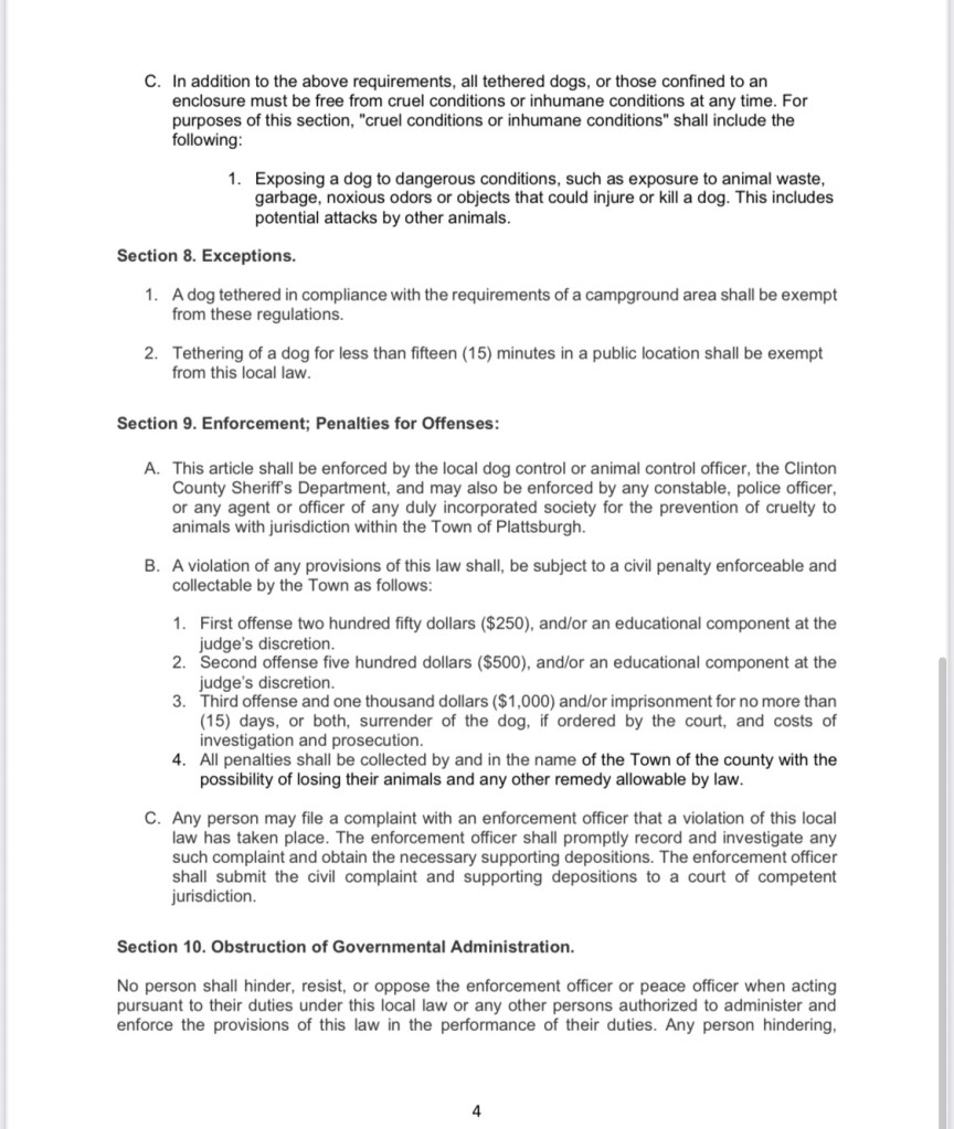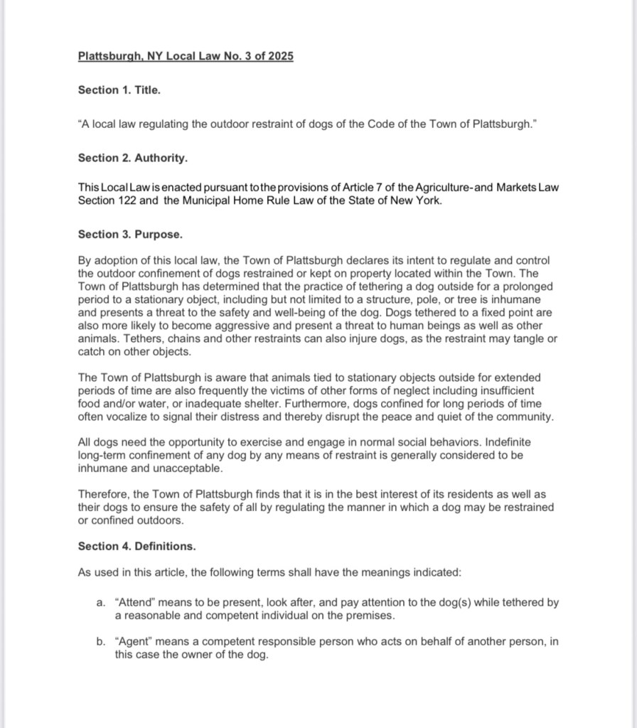 The Town of Plattsburgh- The Town of Plattsburgh approved their Dog Tethering Law with their public hearing on May 8, 2025. They took the Champlain law and made a few corrections as they felt they were necessary. Thank you to the Town of Plattsburgh!